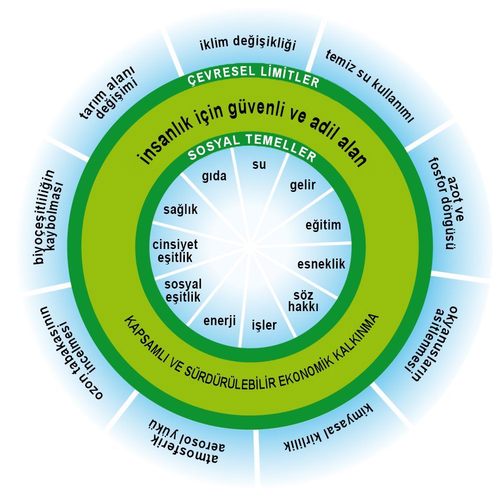 Donut ekonomisi, Oxford Üniversitesi Çevre Değişikliği Enstitüsü'nde kıdemli bir araştırmacı ve öğretim görevlisi olan Kate Raworth'un fikri. Raworth, 2012 yılında ekonomik büyüme arzusunun sürekli olarak dünyayı eşitsizliğe ve ekolojik çöküşün derinleşmesine doğru itip geçmediği konusunda tartışmayı teşvik etmek için çalışmalar yaparken bu modeli öne sürdü. Raworth'a göre amaç, “gezegenin araçları dahilinde herkesin ihtiyaçlarını karşılamak” olmalıdır. Detaylı açıklama için buraya tıklayınız.