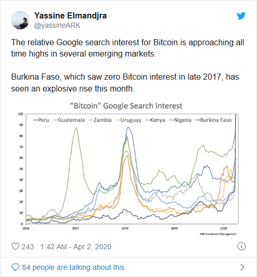 ARK Invest'te bir kripto para analisti olan Yassine Elmandjra bazı veriler paylaştı. Bu verilere göre “Bitcoin” terimi için yapılan Google aramaları birkaç gelişmekte olan pazarda -Peru, Guatemala, Zambiya, Uruguay, Kenya, Nijerya, Burkina Faso- tüm zamanların en yüksek seviyesine yaklaştı. Bitcoin'de ilk arama artışı 2017-2018 balonu zamanında olmuştu.