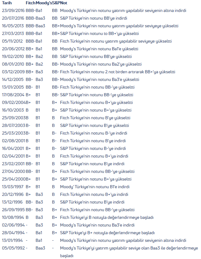 Türkiye’de ofisi bulunan tek derecelendirme kuruluşu Fitch’dir. Türkiye’nin ilk kredi notu 1992 yılında Standart&Poor tarafından verildi. S&P’nin Türkiye için kredi notu BBB – durağandı. Yıllara göre Fitch Türkiye kredi notları*: