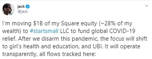 Jack Dorsey, hayırseverlik fonu aracılığıyla kişisel servetinin %28'ini koronavirüs yardımına adadı. Dorsey, dijital ödeme grubu Square'deki özkaynaklarını yardım için transfer edecek. Bağışın toplam miktarı 1 milyar dolar olacak.